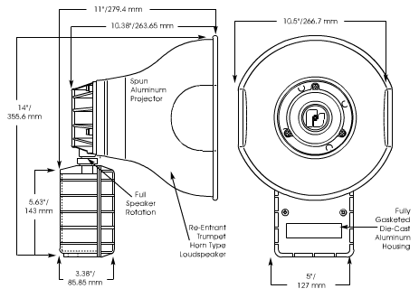 The AM302 is a rugged, transformer coupled, re-entrant speaker for use in a public address or paging application. This 30 watt speaker features a durable speaker cone and projector constructed of spun aluminum. The speaker wiring connections are enclosed in a dust- and moisture-proof, die-cast aluminum compartment. All external surfaces are sealed with a gray powder coat paint.