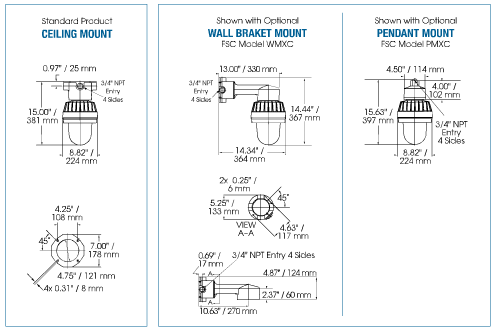 Model FB2PSTX has a self-contained power supply. The copper-free aluminum finned base dissipates heat and ensures long life. The outer dome is made of tempered glass. Polycarbonate inner lenses are available in amber, blue, clear, green and red. A rugged ceiling mount fixture is standard; optional wall mounts and dome guards are also available.