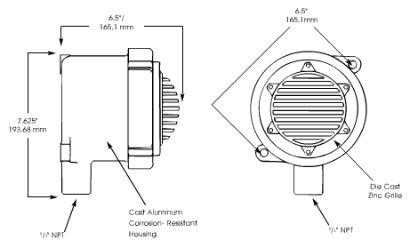 These Federal Signal explosion-proof vibrating horns are constructed for safe use in hazardous environments. They are enclosed in a heavy-duty copper-free cast aluminum housing tapped for 3/4-inch conduit.