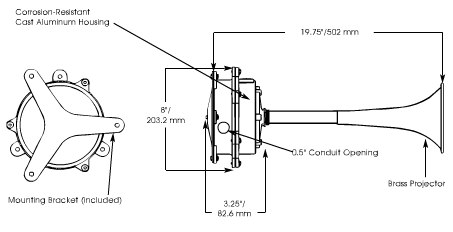 Both models feature corrosion-resistant cast aluminum housings with a brass projector. These projectors are designed to match the frequency of the vibrating diaphragm to produce a smooth musical tone. The housings are tapped for 1/2-inch conduit (swivel bracket included).