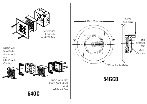 The 54GCB is designed for areas without high ambient noise levels, such as offices, hallways and reception areas. The baffle allows the four-inch speaker to be installed easily in any suspended ceiling plenum with a Model R4NB backbox. The white grill of the 54GCB is attractive in most decors.