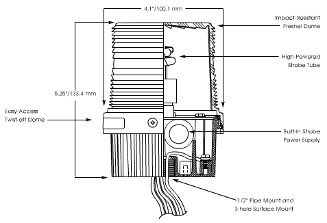 The FB24ST features a unique dome that twists off easily for quick dome and lamp replacements. The newly redesigned base features an integrated 1/2-inch pipe mount boss as well as the three holes required for surface mount configurations. Black epoxy paint is electrostatically applied to the base for superior corrosion resistance. The Fireball dome and base design provides a watertight, dust-tight and corrosion resistant Type 4X rating.