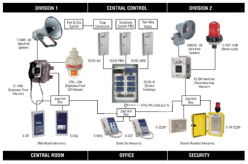 ECHO digital intercom and communication systems provide addressable intercom, public address, general alarm, paging and telecommunication capabilities. A single ECHO system can provide the same level of safety, coverage and reliability normally achieved with multiple systems.