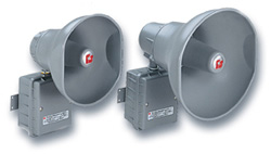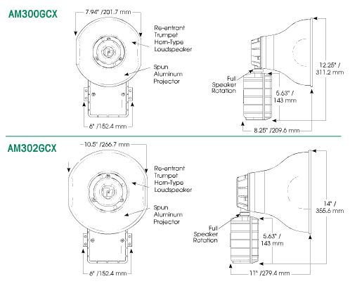 Federal Signal Models AM300GCX and AM302GCX are rugged, transformer coupled, re-entrant speakers for use in public address or paging applications. These speakers feature rugged cones and projectors constructed of spun aluminum. The wiring connections are enclosed in a dust- and moisture-proof, die-cast aluminum compartment. All external surfaces are finished with a gray powder coat paint.