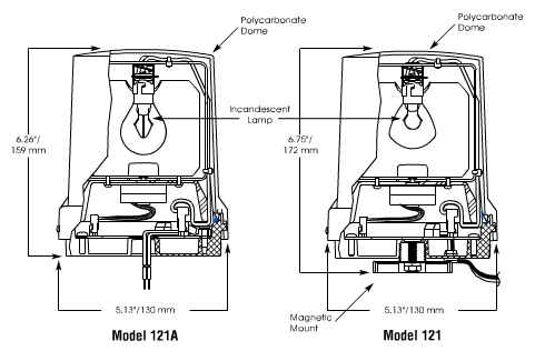 The 121A rotating light is designed for both vehicular and in--plant applications. This unit can be surface mounted or mounted on a 1/2" pipe with the integrated pipe mount. The 121A is available in 24VDC. The enclosure is also rated Type 4X for a water tight and dust tight seal.