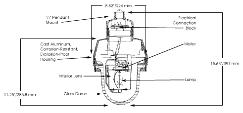The 121X features a spring-clip mounted lens for quick access when inspecting or relamping. A pendant mount is supplied, and a ceiling mount and 90º wall mount are available options. Installation is simple; with the mounting box in place, the fixture is threaded onto the mounting box, making the electrical connection. Electrical continuity is made when five threads are engaged.