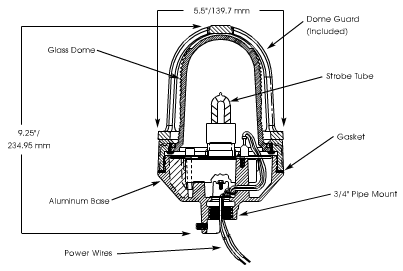 The 151XST meets Type 4X water-tight, dust-tight, and corrosion-resistant requirements; constructed to IP66. This hazardous location warning light has an aluminum base, coated for corrosion-resistance that is ready for mounting on a 3/4-inch pipe. The Dome Guard (included) fits over the glass dome to protect it against accidental collision with moving equipment, such as forklifts.