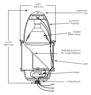 A high intensity 65 watt sealed beam lamp projects a fixed beam downward onto a 360º rotating reflector set at a 45º angle, producing the 60 flashes per minute in all directions.