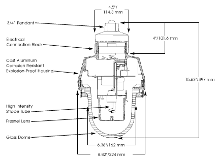 Federal Signal's Model 27XST has an effective candela (ECP) of 850 and a two million peak candela. A pendant mount is supplied, and a ceiling mount and 90º wall mount are available options. For easy installation, the mounting box is first installed and the fixture is then threaded onto the mounting box, making the electrical connection. Electrical continuity is made when five threads are engaged.