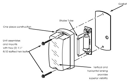 The user replaceable strobe tube is rated for 4,000 hours of life. The LP1 is available in 12VDC, 24VDC, 120VAC and 240VAC versions. The unit is UL and cUL Listed. Access to the printed circuit board and strobe tube is provided through the back of the unit.