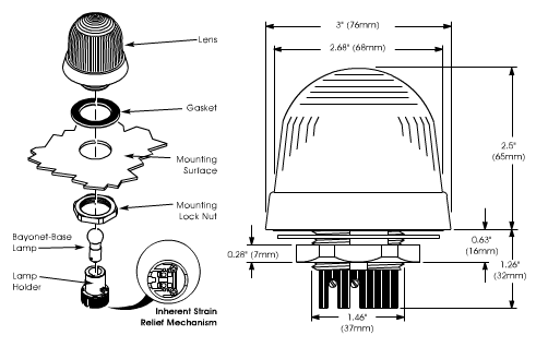 The StreamLine® Model LP2 is a unique, steady burning incandescent light, ideal for both horizontal and vertical panel mount installation. This device mounts easily through any 1.54" (39mm) diameter hole; a lock nut secures the light firmly in place. A gasket positioned above the mounting surface assures a water-tight and dust-tight fit. The lamp is easily replaced from below the mounting surface. Inherent strain relief secures all wiring from the rear, for added durability. The enclosure consists of a polycarbonate dome in five colors (amber, blue, clear, green and red), and a polyamide base; the enclosure with gasket is rated Type 4X.