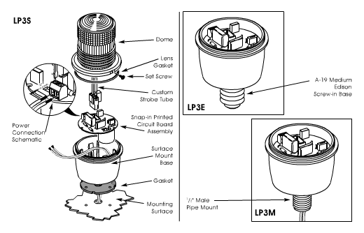 The LP3 is offered in three mounting configurations: the LP3S features a three-hole surface mount - ideal for control panels and other flat or flush surfaces; the LP3E features a standard A-19 medium Edison screw base; the LP3M features a 1/2" male pipe mount and 18' wire leads.