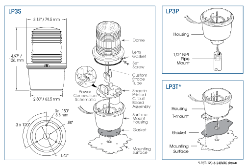 | LP3T-120C | Strobe, "T"-mount, 120VAC, clear | 0.53 lbs. | 0.46 lbs. | Add to Quote > |