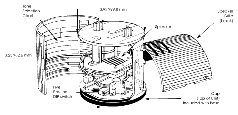 The sound module contains a microprocessor-based tone generator and an integrated speaker which produces one of 18 tones. Select tones by setting five, 2-position DIP-switches. The sound module can work as a stand-alone audible signal when plugged into the Model LSBS Low Profile Surface Mount Base or Model LSB Pipe Mount Base.