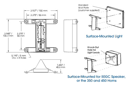 Knockouts on the 50GC and the 350 audible devices ensure easy installation. The units can be either independently or simultaneously wired with the audible device. Model VALS uses a linear strobe tube and all the circuitry is contained within the lens.