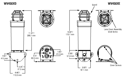 The WV series comes standard with metric entries, a 316 stainless steel dome guard and a 10,000 hour rated strobe tube. There are two versions of the WV450X available with three Joule options each (10J, 15J and 21J). The flameproof "D" versions come standard with a 316 stainless steel mounting brackets and two M20 entries for field cable gland connections. The increased safety "E" versions have the added feature of a terminal chamber with three M20 entries. The increased safety design allows for quick field termination and pass through wiring.